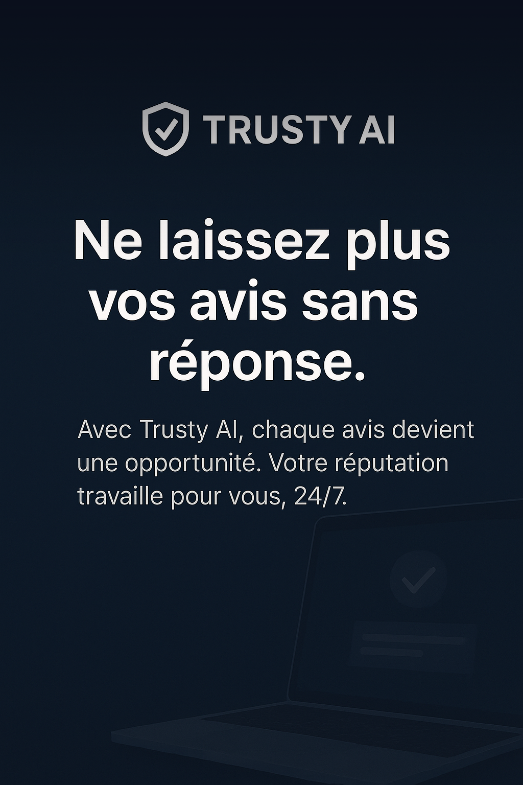 👉 Trusty AI répond automatiquement à vos avis Google, 24/7, avec des messages courtois et adaptés à votre secteur. Ton configurable (pro, chaleureux, formel), personnalisation (nom, contexte) et filtre “mots sensibles” pour éviter les faux pas. Vous gagnez du temps, gardez une voix de marque cohérente et transformez chaque avis en opportunité — en prévalidation ou en réponse autonome, au choix. Continuez à optimiser vos réponses aux avis Google pour renforcer la confiance des clients et améliorer votre image de marque.
